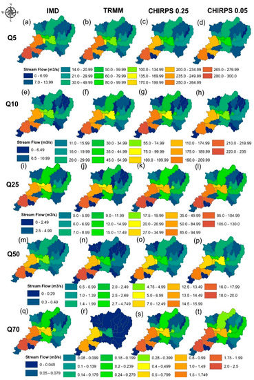 The IMD and CHIRPS-0.25 data depicted the same kind of median flow (Q50) distribution, whereas TRMM underestimated it at the mountainous region of the catchment. For estimating agricultural water availability corresponding to Q70, CHIRPS-0.25 data were good since they exactly corresponded to the IMD flow. The TRMM underestimated Q70 for more than half of the catchment, indicating its weakness for producing this flow. It is to be noted that one cannot judge a dataset as the best merely by just finding the performance indices. Further analysis has to be carried out for finding the capability of data and its uses based on its application of the study [19,26]. For simulating high flows, TRMM and CHIRPS may be used, whereas the TRMM is not suitable for low flow studies. It also may be noted that the increased resolution of CHIRPS data did not improve the spatial representation of flow quantile.