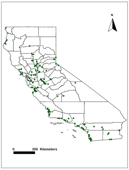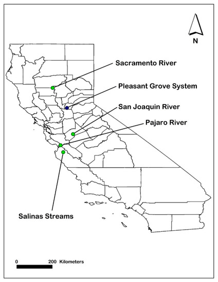 Long term California sediment stream systems sampled for bifenthrin with ≥ 6 year time span, ≥6 total data points and at least three different sample sites from the 2001–2019 CEDEN and Hall et al. [8]. Locations presented are the means of the latitudes and longitudes for the individual sample sites from the stream system. The four sites presented in green had at least one detected value and the one site presented in blue was the only site with a significant regression (decreasing bifenthrin trend).