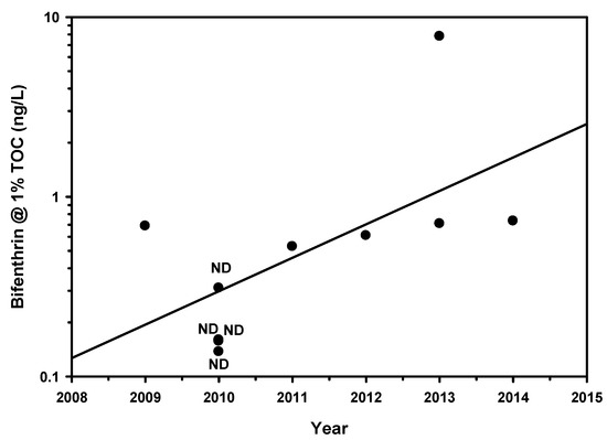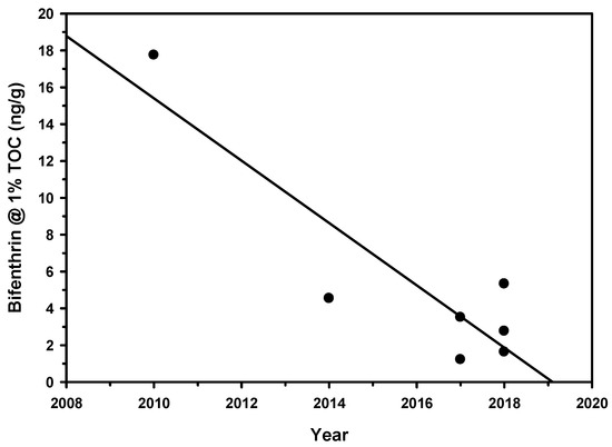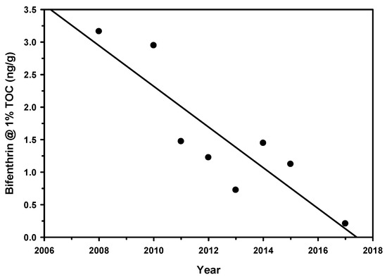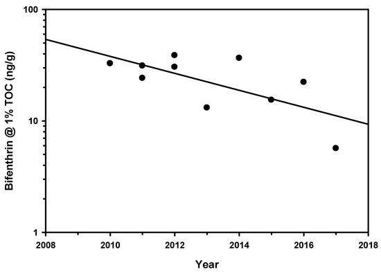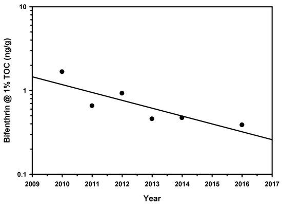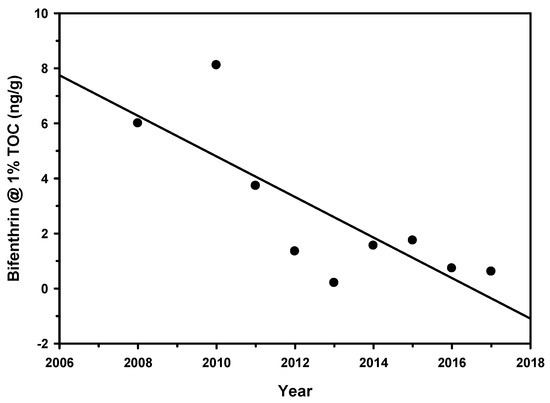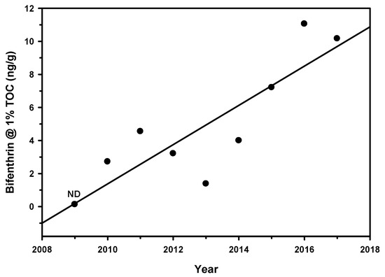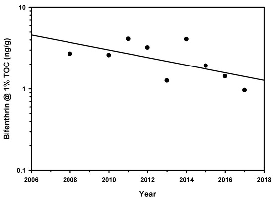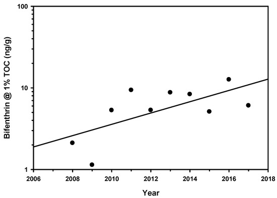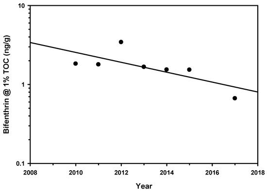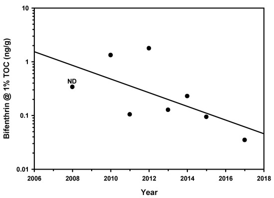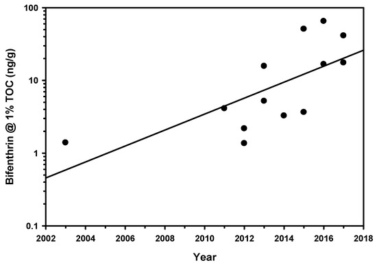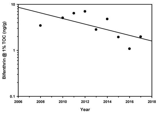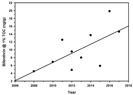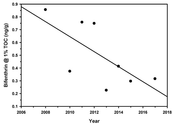 The bifenthrin sediment data from California waterbodies used for the trends analysis presented n this paper were obtained from CEDEN (available at www.ceden.org database accessed on 15 November 2019). CEDEN data are considered high quality data compatible with California’s Surface Water Ambient Monitoring data. Bifenthrin sediment data from various sites in two water bodies (Pleasant Grove Creek and Salinas Streams) were also included in the trends analysis by watershed [8]. Bifenthrin sediment data were obtained from sampling conducted during the 2001 to 2019 time period. In the analysis presented below, non-detected concentrations were assigned a value of ½ the detection limit as recommended by other investigators [9,10]. A measurement that is defined as non-detected does not imply that there is some concentration of bifenthrin present. Bifenthrin is a hydrophobic insecticide that absorbs to organic carbon [11]. Bifenthrin sediment concentrations were measured from sediments with varying concentrations of organic carbon. There was a significant direct (positive) relationship between Total Organic Carbon (TOC) and bifenthrin concentrations using Spearman Rank Order Correlation analysis (r = 0.558; p < 0.001) [12]. Therefore, to provide a consistent carbon normalized measurement that can be used for trends analysis all sediment concentrations were normalized to ng/g at 1% TOC which is common practice used by other investigators [13].