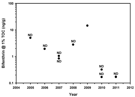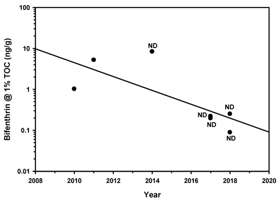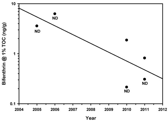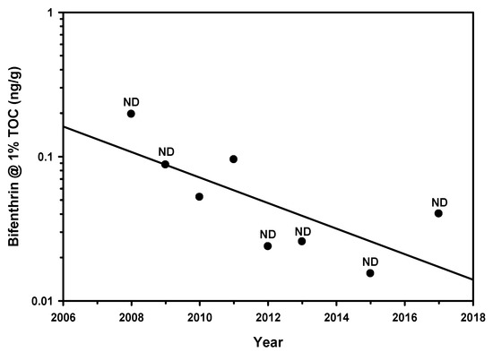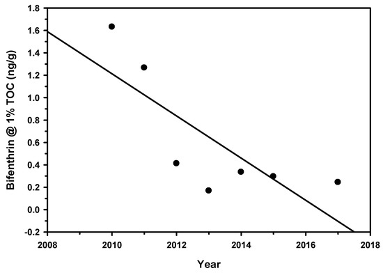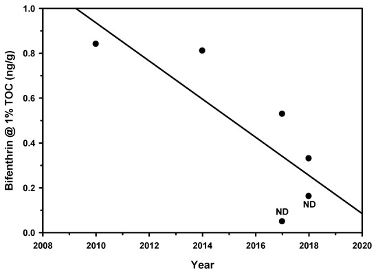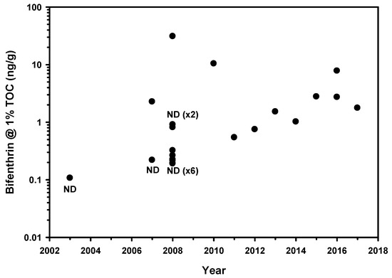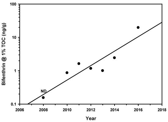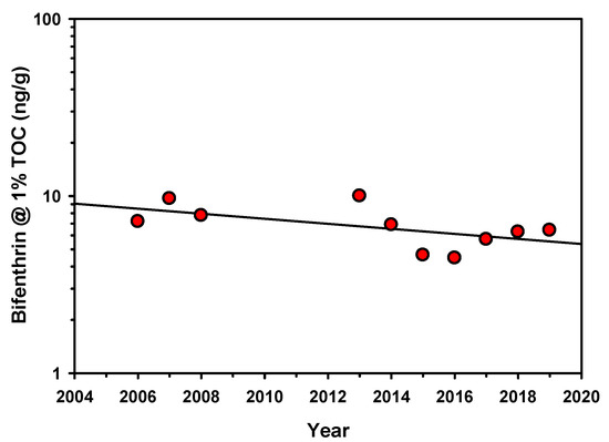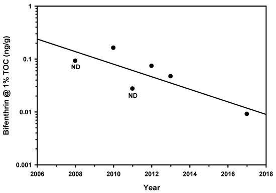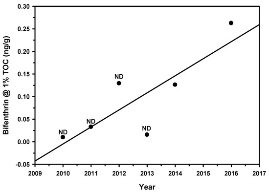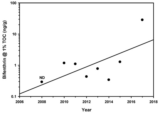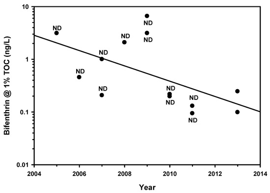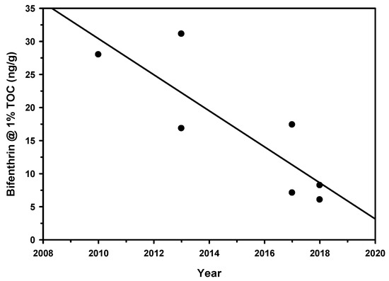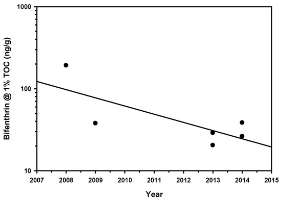 The bifenthrin sediment data from California waterbodies used for the trends analysis presented n this paper were obtained from CEDEN (available at www.ceden.org database accessed on 15 November 2019). CEDEN data are considered high quality data compatible with California’s Surface Water Ambient Monitoring data. Bifenthrin sediment data from various sites in two water bodies (Pleasant Grove Creek and Salinas Streams) were also included in the trends analysis by watershed [8]. Bifenthrin sediment data were obtained from sampling conducted during the 2001 to 2019 time period. In the analysis presented below, non-detected concentrations were assigned a value of ½ the detection limit as recommended by other investigators [9,10]. A measurement that is defined as non-detected does not imply that there is some concentration of bifenthrin present. Bifenthrin is a hydrophobic insecticide that absorbs to organic carbon [11]. Bifenthrin sediment concentrations were measured from sediments with varying concentrations of organic carbon. There was a significant direct (positive) relationship between Total Organic Carbon (TOC) and bifenthrin concentrations using Spearman Rank Order Correlation analysis (r = 0.558; p < 0.001) [12]. Therefore, to provide a consistent carbon normalized measurement that can be used for trends analysis all sediment concentrations were normalized to ng/g at 1% TOC which is common practice used by other investigators [13].