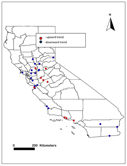 Twenty-nine long term bifenthrin sediment sample sites with significant regressions or correlations from the statistical trends analysis. Red dots indicate long term sites with upward trends in bifenthrin concentrations over time and blue dots downward trend.