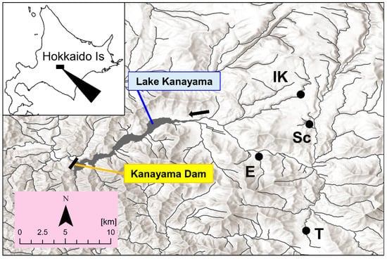 This study was conducted in the upper section of the Sorachi River in the Ishikari River system, which is the second largest watershed in Japan (Figure 1). All the study sites are located upstream of Lake Kanayama, which was formed by the construction of the Kanayama Dam in the 1960s []. The watershed area of the Kanayama Dam is 470 km2 [], and there is a relatively small number of artificial barriers in this watershed. The fish compositions among tributaries are different due to their heterogeneous environment, but overall, Salvelinus malma krascheninnikovi, Cottus nozawae, Barbatula oreas, and Parahucho perryi inhabit this watershed. There were no records of white-spotted charr being artificially released in this area, so we considered all caught individuals to be native.