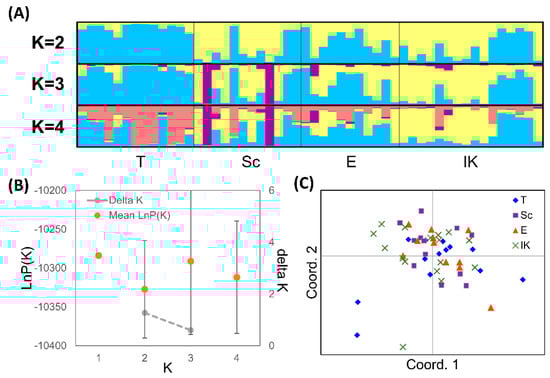 The results of individual-based analysis. (A) Population structure inferred by the STRUCTURE algorithm; (B) The values of posterior probability of the data (LnP(K)) from 20 runs for each value of K (1–4) and Evanno’s ΔK in the STRUCTURE analysis; (C) Graphical display of the first two principal coordinates of the principal coordinates analysis (PCoA).