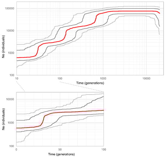 Demographic inference by stairway plot. The red line shows the median estimate of the effective population size. Gray lines indicate 75% (dark) and 95% (light) confidence intervals obtained by 500 bootstraps. Below is the semilog graph for the last 100 generations.