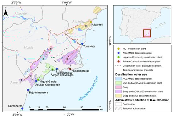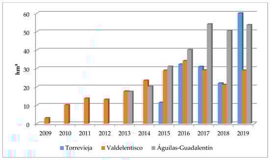 In order to solve the lack of infrastructure and regulation capacity, as well as the limitations of the distribution network, the SCRATS manages a system of water concession swap between irrigation communities that have allowed the exchange of conventional water concessions for desalinated water ones among coastal and inland irrigators. In this way, the irrigation communities of Alhama de Murcia, Librilla, Lorca, El Saltador, and Pulpí receive additional conventional water sources conceded to another one, such as Campo de Cartagena or even the MCT, which transfer their water rights in exchange of desalinated water produced in the Torrevieja desalination plant. However, the irrigation communities that receive conventional water sources through this swap system have to pay this water as if it were desalinated, in order to transferors do not suffer additional expenses. All these measures, activated following the enactment of the Drought Decree, has enabled the expansion of the production of desalinated water for irrigation uses, especially in the desalination plants owned by ACUAMED (Figure 1).