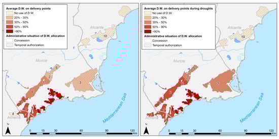 Average desalinated water (D.W.) use on delivery points in normal hydrologic conditions and drought situations. Note: irrigation communities: 1. Águilas; 2. Alhama de Murcia; 3. Campo de Cartagena; 4. El Saltador; 5. Librilla; 6. Lorca; 7. Mazarrón; 8. Puerto Lumbreras; 9. Pulpí; 10. Riegos de Levante; 11. Totana.