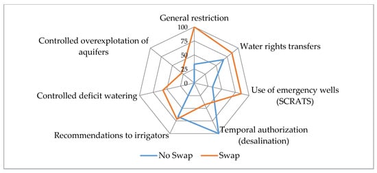 This situation has led to the progressive desalination development, especially from 2015 with the tightening of the conditions for the TST, the advent of a drought situation and the approval of the Drought Decree. Furthermore, to alleviate this situation, irrigators have implemented a series of measures. The ones most frequently indicated are the general restriction of water, with the exception of the Águilas and Mazarrón irrigation communities, which have their own desalination plant, and the establishment of water rights transfers, a measure that is centrally managed by SCRATS (both pointed out by 8 out of 10 irrigation communities). In the second place, the irrigators note that they depend on the use of emergency wells (managed by SCRATS during droughts situations), the making of recommendations on the water use to the irrigators and requesting temporal authorizations for the use of desalinated water (pointed out by 7 out of 10 irrigation communities). To a lesser extent, some irrigation communities declare to deal with under-provision through controlled deficit watering (pointed out by 4 out of 10 irrigation communities) or controlled overexploitation of aquifers (pointed out by 2 out of 10 irrigation communities). However, it is worth noting that in those irrigation communities involved in the swap system there is a greater heterogeneity of measures aimed to solve under-provision of water (Figure 4).