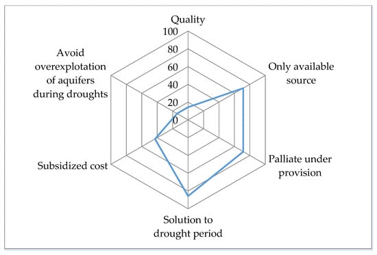 Regarding seasonal variations in desalinated water use, irrigators claim heterogeneous responses. On the one hand, Alhama de Murcia, Campo de Cartagena, Puerto Lumbreras, and Totana affirm that there is not a maximum and minimum desalinated water use throughout the year since they receive a uniform monthly volume, although irrigation needs do with higher demand during summer. On the other hand, El Saltador and Lorca claim that desalinated water use rises during drought situations due to the reduction of the TST contribution. Likewise, some of the irrigation communities specialized in greenhouse and hydroponic crops, such as Águilas, Pulpí, or Mazarrón, pointed out that the maximum water use is produced between September and April. Beyond the seasonal variations in desalinated water use, the main factors that explain the greater use of this water source are that it is the only source available; it allows alleviating the structural under-provision of water; and it is a solution to drought situations. To a lesser extent, irrigators point out that the greater use of desalinated water is explained by its subsidized cost, because it allows avoiding the overexploitation of the aquifers during drought situations and that it increases the quality of the water used for irrigation (Figure 5).