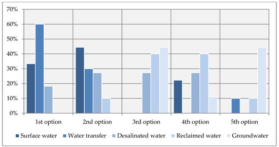 In a scenario based on a hypothetical situation where water prices where the same for all the supply sources, desalinated water appears as the third option after surface water (both from the Segura basin and from the TST) (Figure 6). These results confirm that in recent years it has been an evolution in the acceptance of desalinated water among farmers since in the Níjar municipality, located a few kilometers further south our study area, in 2016 desalinated water was the worst valued option []. However, in that case, the obtained results came from farmers who did not use desalinated water, although they were considering the possibility of using it.