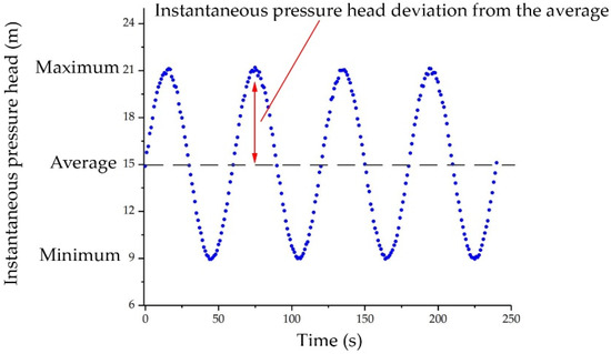 Traditional irrigation uses constant water pressure. However, in recent years, the applications of oscillating water flow with low operating pressure in irrigation showed that they can overcome the above-mentioned problems. The turbulence in the passage of emitter is more intense because of the oscillating water flow, thereby increasing the water flow velocity in the emitter, decreasing the probability of deposition of the suspended solids in the emitter passage, and reducing the clogging in the emitter [20,21,22]. Oscillating water flow can significantly improve the uniformity of the water distribution of sprinklers and reduce the high sprinkler intensity and kinetic energy of water droplets of sprinklers, thereby lessening soil erosion and surface runoff [23,24,25,26]. This application differs from common transient flow, such as water hammers in water conservancy engineering structures (e.g., hydropower stations and pump stations), where instantaneous pressure head changes irregularly over time. The research on water hammers is relatively mature, and many methods, such as the method of characteristics, have been developed, which can calculate the instantaneous pressure head [27,28,29,30,31,32]. On the other hand, the instantaneous pressure head of oscillating water flow changes periodically over time, and both the maximum and minimum instantaneous pressure heads remain basically the same, as shown in Figure 1. The variation law of the instantaneous discharge and instantaneous velocity of oscillating water flow with time is similar to that of instantaneous pressure head. However, the research on the instantaneous pressure head calculation of oscillation water flow has only just started, in which a complex function has been used to solve both the continuity equation and the momentum equation of transient flow. A model that can calculate the amplitude of the pressure head loss of oscillation water flow in a pipe accurately has been developed [33].