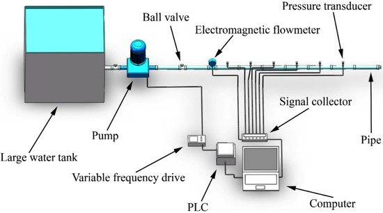 As shown in Figure 2, the main components of the experimental equipment for testing the oscillating water flow are the pipes, water tank, pump, variable frequency drive, computer, pressure transducers (range = 0–0.6 MPa, accuracy = 0.1%), and electromagnetic flowmeter (range = 0.07–80 m3/h). The oscillating water flow is generated by a programmable logic controller (PLC), variable frequency drive, and pump. The program for the oscillating water flow mode is input into the programmable logic controller to control the variable frequency drive, which controls the operating frequency of the pressurized pump. When setting the oscillating water flow parameters, the maximum and minimum of instantaneous pressure heads can also be set, and the period of oscillating water flow can be adjusted. The pressure signal and discharge signal are recorded by a signal collector and sent to a computer.