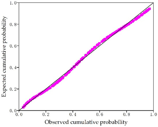 The normal probability–probability plot of standardized residual (p-p plot) can indicate whether the residual among variables conforms to the normal distribution. From Figure 5, it can be seen that the points are basically distributed along a straight line. This is an indication that the residual of variables is normally distributed [42,43,44].