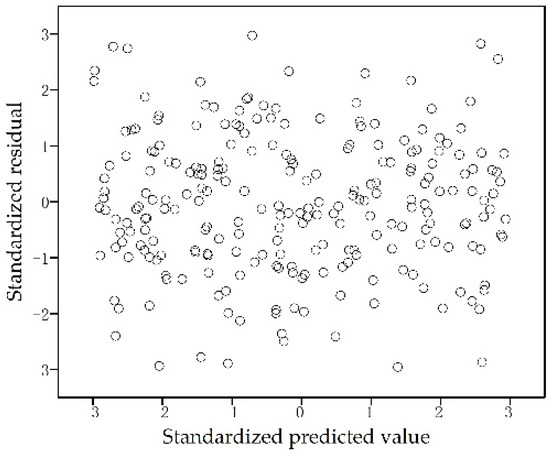 The distribution of the standardized predicted values and the standardized residual can indicate whether there is heteroscedasticity in the residual of the variables. From Figure 6, it can be seen that the points are randomly distributed and do not show an obvious trend, and the points almost fill the whole panel space. This is an indication that heteroscedasticity does not exist in the residual of the variables [45,46].