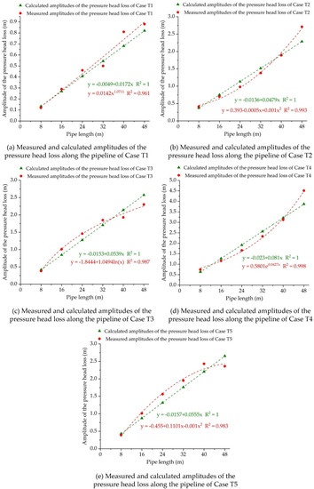 Comparisons of measured and calculated amplitudes of the pressure head loss along the pipe for (a) Case T1, (b) Case T2, (c) Case T3, (d) Case T4, and (e) Case T5.