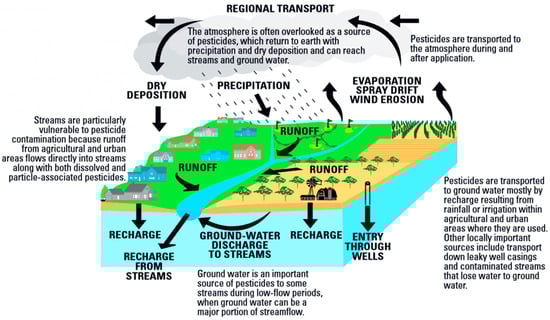 Pesticides can also be transported into natural bodies of water such as rivers and groundwater; for example, insecticides from a corn field may end up in a nearby stream due to runoff, or they can seep into groundwater by leaching []. The fallout from airborne pesticides can also contribute to this pollution. These transport phenomena do not occur independently of each other but are intimately linked in a cyclic network of processes observed and proposed by Majewski and Capel [], based on the U.S. Geological Survey and depicted in Figure 1 [].