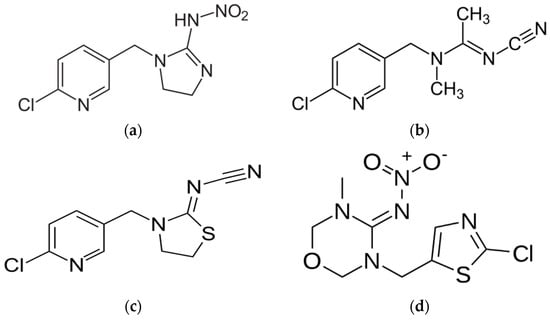 Molecular structures of neonics examined in this work. (a) Imidacloprid; (b) Acetamiprid; (c) Thiacloprid; and (d) Thiamethoxam.