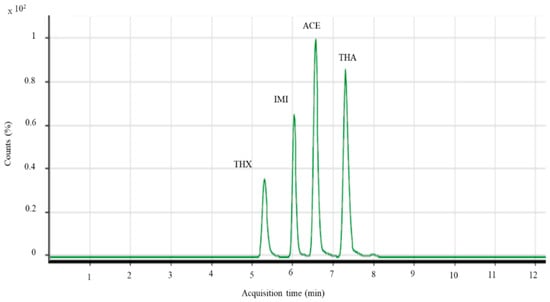 The time for the elution of the four neonics was within 15 min. The injected volume was 10 µL of liquid. The characterisation of the masses was performed by the infusion of each of the four neonics after several injections []. Mass scan was performed in positive mode with electrospray ionisation (ESI). The collision energy was tuned for better fragmentation between masses = 8 to 42 and the ions were well fragmented, with both precursor and product ions as shown in Table 2. The precursor and product ions were used for the quantification and confirmation of the analytes [,]. The multiple reaction monitoring parameters (MRM) were in agreement with the ones reported by Sugathi et al. [] in a study on the determination of neonic residues in sugar cane juice. The total ion chromatogram of the four neonic compounds is shown in Figure 3.