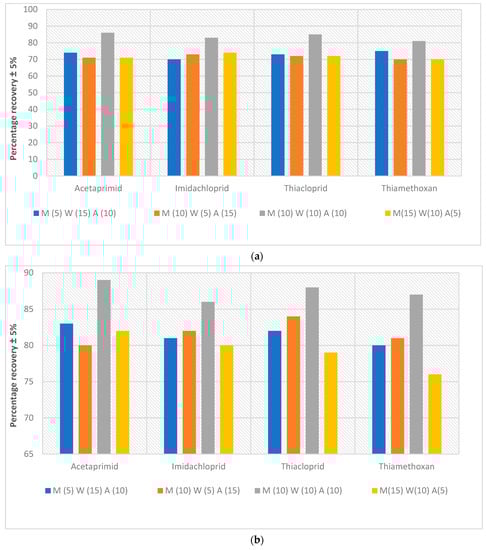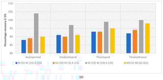 Figure 4. (a) Recovery of neonics at 1 ppm spikes. M = CH3OH, W = D.I. water, A = Acetonitrile. The bracketed numbers are liquid volumes in mL (cm3). (b) Recovery of neonics at 0.5 ppm spikes. M = CH3OH, W = D.I. water, A = Acetonitrile. The bracketed numbers are liquid volumes in mL (cm3). (c) Recovery of neonics at 0.1 ppm spikes. M = CH3OH, W = D.I. water, A = Acetonitrile. The bracketed numbers are liquid volumes in ml (cm3).