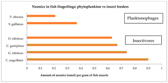 Samples from six fish species that are cultured in Nigeria were collected and analysed. There were three individuals collected for each species (i.e., there were two replicates for each fish species), and therefore the total number of individuals, n, tested for their neonic contents at Kingston University was n = 6 × 3 = 18. The fish were caught by gill nets of 2 mm gauge. At the time of netting, it was not known if any of the fish contained any detectable neonic. The fish skin was removed, and the muscle tissues were dissected from the fish and homogenised with a meat grinder. All fish samples were kept frozen and flown to the UK where extraction and analysis of neonics would take place at Kingston University [,].