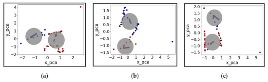 Principal component scores for the two components (x_pca means the first component score; y_pca means the second component score) by K-mean under varying rainfall scenarios: (a) 3 h’ duration rainfall, (b) 12 h’ duration rainfall, (c) 48 h’ duration rainfall. The principal component scores are used to examine if these two clusters are reasonably distinguished from each other clustering (gray circles the blue and red dots assigned to the closest cluster).