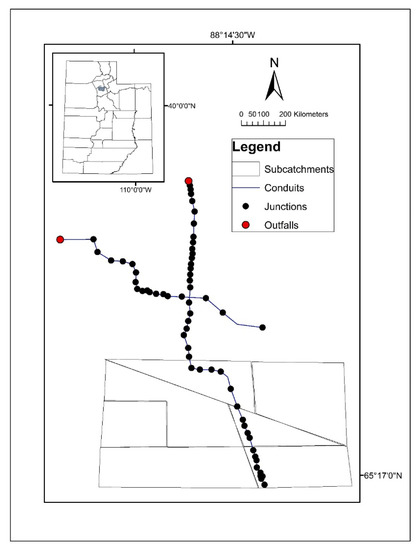 A real-world urban stormwater system located in Salt Lake City, UT, U.S., was selected as the case study, shown in Figure 3. This study case, with an area of 81-ha, is semi-arid, and has soil composed of four primary types: alluvial fan, artificial fill, silt and clay, and sand and gravel deposits. The soil surrounding the study area is classified as hydrologic soil groups B and C, with low infiltration capacity, which has a relatively poorly draining surface. Due to climate change and urbanization, the studied area has suffered from floods more frequently than 1990s, and the increase in the magnitude and duration of the storm events has pushed the resulting stormwater system out of service. This urban drainage network was represented by a rainfall-runoff SWMM model. SWMM is a state-of-art tool developed to help support local, state, and national stormwater management objectives to reduce runoff, discharge, and improve stormwater quality [63,64]. It has been widely used all over the world in similar type of investigations including stormwater runoff, combined and sanitary sewers, and other drainage systems [65,66,67]. Figure 3 shows the components of this SWMM model, which includes one rain gauge, 60 junctions, 61 conduits, two outfalls, and seven sub-catchments, while the groundwater interflow, water evaporation, snowmelt, and manhole hydraulic loss are neglected during the simulation [68].