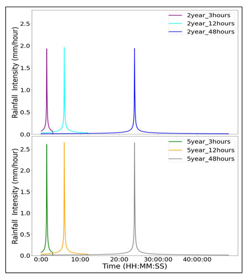 For this study, we created 6 artificial precipitation series according to the Chicago distribution method in PCSWMM v.7.3, and then imported them as modeling inputs. The distribution for the synthetic rains is shown in Figure 4. These rainfalls with durations of 3 h, 12 h, to 48 h and return periods ranging from 2-year to 5-year almost contain all typical features and characteristics of real storms in the study area. Additionally, rainfall measurements for two real rainfall events were collected to test the clustering algorithm. These rain records from 5 May 2015 rainfall event and 8 July 2015 rainfall event are representative for the typical real storms under average climatic conditions in the study area. Compared with water depth generated by the artificially designed rainfall data, the time-series water depth produced by the real-world storms contains more non-stationarity and noise. Nevertheless, the obtained findings are subsequent validated with real rain records.