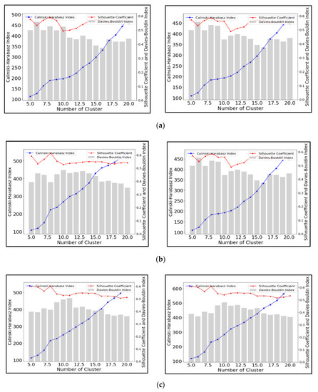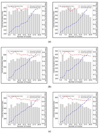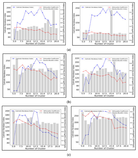 Current machine learning techniques mainly fall into two groups: supervised and unsupervised learning [41]. The UMLA is a self-organization method to find patterns in unlabeled data. Cluster analysis is, a subset of UMLA methods, and in general, is based on the principle of grouping similar observations and segmenting dissimilar observations [42]. Anomalous data points that differ from others may then be filtered [43]. A large number of clustering algorithms exist, including K-means, Affinity Propagation, and Mean Shift. In this research, we employed the SCI, CHI, and DBI to assess the performance of the cluster, because of their accuracy and wide applicability in a similar type of studies [44,45,46].