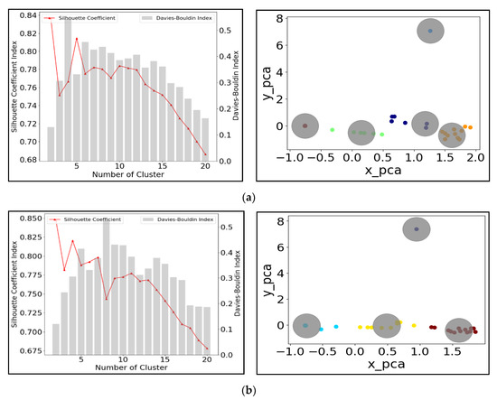 The DBI can also be used to evaluate the model, where a lower DBI relates to a model with better separation between the clusters [59]. The index is defined as the average similarity (Rij) between each cluster k and the next closest (i.e., most similar) cluster. The DBI is calculated as Equation (8):