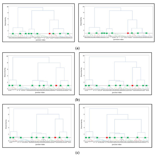 A dendrogram is a visualization in the form of a tree that shows the hierarchical relationship like the order and distance (dissimilarity) between samples [62]. The individual samples are located along the bottom of the dendrogram and referred to leaf nodes. The hierarchical clusters are formed by merging individual samples or existing lower-level clusters. In a dendrogram, the vertical axis is labeled distance and refers to a dissimilarity measure between individual samples or clusters. Generally, in a dendrogram, horizontal lines can be regarded as places where clusters merge, while vertical lines show the distance at which lower-level clusters were merged, forming a new higher-level cluster. The dissimilarity measure between two groups is calculated as Equation (12):