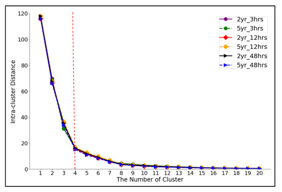 The SWMM model was run six times, once with each of the rainfall scenarios described above. We collected the simulated time-series water depth from each node in the stormwater drainage network for cluster analysis. As there are 60 junctions in the SWMM model, this results in a matrix where each column represents a single time step with a 5-min interval, and each row (60 rows) stands for a junction or node in the network. We then used the principal component analysis (PCA) to reduce the dimensionality of this matrix. PCA uses the eigendecomposition of the correlation matrix to identify a small set of principal components that represent the majority of variance in the original data [50]. Here, we used correlations between the time-series at different nodes to reduce the column of matrix to 2, which means the number of timesteps is compressed to 2 principal components. Finally, the dataset matrix is configured with 60 rows and 2 columns under each modeling scenarios. The datasets used in this work are not large, and for computational costs are limited. While other techniques for data reduction exist (e.g., correspondence analysis, factor analysis, or non-metric multi-dimensional scaling), we used PCA due to the assumed linear response of the water depth values. Although the reduction of dimensionality might cause data loss or an undesirable relationship between score axes, PCA indeed helps reduce computation time and remove redundant data features in the following cluster analysis.