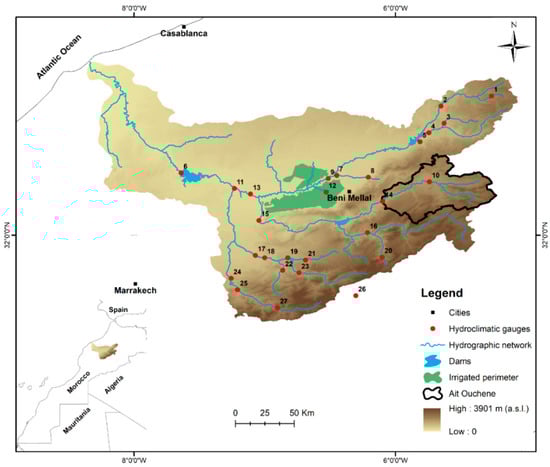 The Ait Ouchen watershed that lies within the limits of the Oum Er-Rbia river basin (OERB) in the center of Morocco was used in this study (Figure 1). The drained area is about 2427 km2, and it is located in the Atlas mountain range with elevations between 953 m and 3230 m.a.s.l. The main river of the watershed (El Abid) feeds Bin El Ouidane, one of the largest dams in Morocco, that contributes to hydropower generation [49,50] and supplies water to support the agriculture activities in irrigated areas [51,52]. The study area is predominantly semi-arid with a mean regional average of around 480 mm·year−1 [53]. The rainfall, characterized by a strong spatiotemporal variability over the mountainous region, is mostly generated under the combined effect of western advections and the orographic uplifting from the Atlas mountain [53]. Two distinct periods mark the annual cycle of rainfall: a wet period (November–April) and a dry period (June–September) separated by two transitory months (October and May). The smallest amounts of rainfall occur during the summer (June, July, and August) while the maximum totals usually take place during the winter months (December, January, and February). Nevertheless, stormy events are predominantly observed during summer and autumn generating high rainfall amounts that can exceed those recorded during the winter. Over high elevations of the Atlas Mountain, part of the precipitations occurs as snow. The latter exhibits a strong seasonality. It starts to take place in mid-November when the temperatures are low enough to allow snow occurrence and start to reduce in size in mid-April to completely vanish during summer [54]. Temperatures down to −9 °C are recorded during winter against a maximum of 41 °C during summer [50].