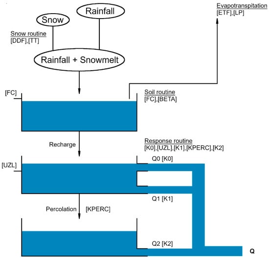 HBV (Hydrologiska Byråns Vattenbalansavedelning) model structure (inspired by Bergström [38]). The model parameters are enclosed in square brackets.