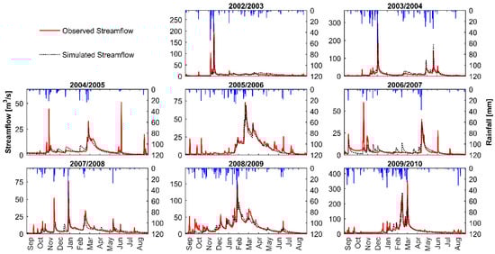 The model was run using data of eight consecutive hydrologic years from 2002/2003 to 2009/2010. The calibration exercise was carried out for each year separately. The statistics of simulations corresponding to NSEs above the 99.5th percentile (hereafter admissible simulations) and the streamflow simulations obtained based on the parameter sets that maximize the NSE during calibration are shown in Figure 3 and Figure 4, respectively. The resulted metrics suggest that, despite the scarcity of climatic data, the model is quite able to reproduce the daily streamflow observed at the outlet of the Ait Ouchene watershed. However, the performance accuracy is highly variable from one year to another, as shown in Figure 3. The model was found to provide the worst simulations in 2004/2005 and 2006/2007 years with maximum (minimum) NSE (RMSE) of 0.44 (3.62 m3/s) and 0.43 (4.14 m3/s), respectively. The low performance obtained in theses two years is largely due to the data quality. Both years presented a remarkable discrepancy between streamflow and rainfall in terms of event occurrence. From Figure 4 we note that there were instances where large amplitudes of streamflow were observed while no rainfall was recorded. This situation often characterizes regions with low-density networks, particularly those that receive local stormy events with smaller extents [84,85]. The performance was relatively higher for the years 2002/2003 and 2007/2008, as illustrated in Figure 3, with NSE (RMSE) values spanning between 0.46–0.79 (6.84 m3/s–10.20 m3/s) and 0.46–0.68 (3.70 m3/s–4.86 m3/s), respectively. The remaining years exhibited good agreement between the simulated and observed streamflow where all the NSE values were above 0.66 (2008/2009) and reached 0.90 (2005/2006), and all corresponding RMSE values were 30% below the standard deviation of the observed streamflow. Previous studies have reported that the calibration results are significantly affected by the changes in hydroclimatic conditions mainly driven by the strong spatiotemporal variability of rainfall [72,86]. The drier conditions are more problematic for conceptual models as they lead to the worst performance compared to humid conditions [64,67,72,86]. In the present study, the data series encompassed both drier and humid years without considering those with remarkable missed events (Table 1). The performance of the model during wet years agrees with the results from previous studies suggesting the easiness of model calibration during relatively wet conditions [36].