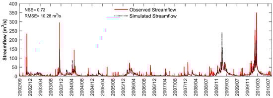 Observed versus simulated daily streamflow using the parameter combinations yielding the best statistical metrics (NSE and RMSE) after validation.