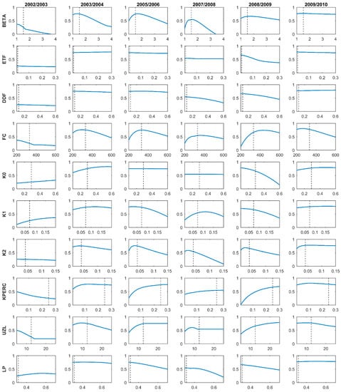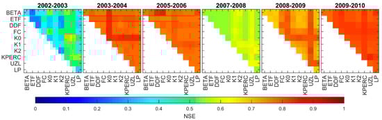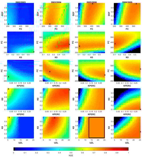 Generally, model parameters, as physical as they sound, may not reasonably describe the reality of the physical processes [88,90], particularly with conceptual models that are highly subject to parameter interdependency. In the present study, we were able to highlight the potential interdependency of the model parameters through the sensitivity analysis. The findings suggest that the change in one of the model parameters due to hydroclimatic conditions, for instance, would be offset by one or more of the remaining parameters to provide the most fitted model to the observed streamflow. This combining effect is responsible to a large extent for the year-to-year variability of the estimated optimal model parameters [66]. To emphasize the interdependency of the HBV model parameters, a bivariate analysis based on the NSE criterion was carried out. It consisted of varying two parameters at a time over their whole predefined range instead of one parameter, while the rest were set to their optimal values obtained after validation. Figure 7 shows the maximum NSE obtained for each couple of parameters, where the diagonal cells of each subplot represent the maximum NSE from the OAT analysis. Previous studies have demonstrated that the use of fewer parameters than the full version has little impact on the model fit [47,90]. Our results show that combining a minimum of two parameters, while the rest are set to their optimized values, leads to NSEs comparable to those obtained during calibration. Still, the couple that yields to the best fit highly depends on the year during which the model is run. Overall, less influential parameters, such as ETF, LP, and DDF, when they were combined brought no significant change compared to the OAT analysis, as shown in Figure 7. However, the incorporation of other parameters, with more influence on the model response, in the parameter couple resulted in higher NSEs. The most significant increases were obtained when one or more of the response routine parameters were considered. This remark holds true for all the studied years unless the conditions were not met to allow the engagement of some of the parameters, such as UZL in 2005/2006 and K0 in 2007/2008 hydrologic years. Overall, the results from all the years lead us to conclude that the combination of the response routine parameters, particularly K0, KPERC, and UZL, yield superior model simulations. Thus, the overall performance of the model would be more sensitive to the response routine parameters than to those of the soil moisture routine, particularly in years with extremely high peak flows. The impact of the response routine on the model performance was obvious in 2002/2003. As shown in Figure 7, the parameter couples constituted either of UZL or KPERC returning the highest NSEs, especially when combined with K0. Furthermore, in years with frequent snow cover (2005/2006 and 2008/2009, Table 1) the couple FC-DDF seemed to result in NSEs as high as those obtained by the response routine parameters.