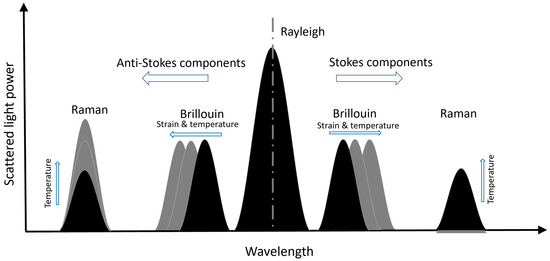 Fibre optic distributed temperature sensing (DTS) relies on a phenomenon called backscatter-light transmitted in the direction opposite to propagation due to material imperfections and molecular interaction [16,17]. The scattered light contains Rayleigh, Raman, and Brillouin spectral components, as shown in Figure 1. Among the three components, the magnitude of the Raman anti-stokes component is sensitive to temperature changes, which is commonly used in scattering applications for structural monitoring. Scattering occurs along the entire length of the fibre; therefore, the entire fibre acts as a series of distributed sensors. Analytical techniques determine the magnitude of environment temperature along the fibre by monitoring the Raman spectra of the backscattered wavelengths caused by individual pulses of light rather than continuous beams. The anti-Stokes and Stokes Raman scattering intensity and can be written as a function of temperature T as [18],