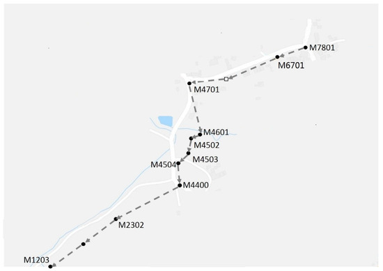 The analyser used in this study was a Halo DTS manufactured by Sensornet Ltd., UK. The spatial and sampling resolution of the analyser was 2 m. In this case study, where rapid dilution and dispersion occurs in the sewer over short distances, a spatial resolution ≥2 m was deemed adequate. Measurements of 1 min were taken every 2 min. The temperature resolution, which is linked to noise and therefore the minimal detectable change, was specified by the manufacturer as ≥0.1 °C for a 1 min measurement. The water-sewer investigated in this study is a domestic foul sewer network in a small town in the UK, as shown in Figure 2. The household wastewater and stormwater are discharged directly into this sewer network. If too much stormwater is added to the flow of sewage, domestic foul sewer overflow could result in a potential health and environmental hazard as it may lead to the flooding of properties and sewage treatment works. Hence, one crucial role of the management of such domestic foul sewer system is to reduce the hydraulic overloading and domestic foul sewer overflow emissions.