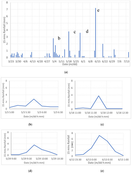 Recorded rainfall and storm: (a) Recorded rainfall by rainfall gauge; (b) Rainfall on 3 May; (c) Rainfall on 18 May; (d) Rainfall on 29 May; (e) Rainfall on 13 June.