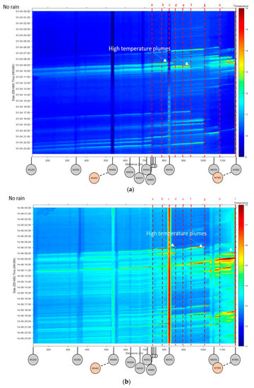 Distributed temperature sensing (DTS) results without rain: (a) 1 April; (b) 14 June.
