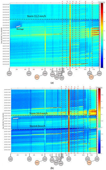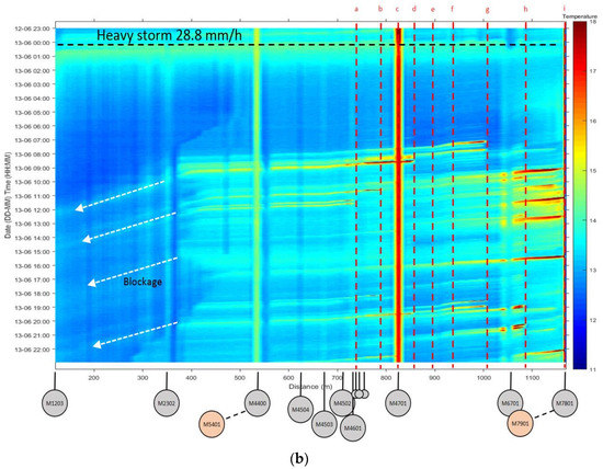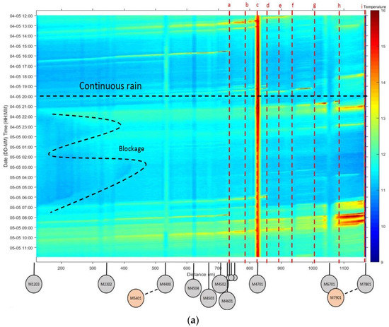 Locations at M4400 and M4701 on the graph were manholes where the fibre ends were spliced. The splice was secured underneath the manhole cover by a braided steel cable anchored to the ground just outside the manhole cover area. This resulted in a FOS loop approximately 6 m long. M4400 had a tree canopy, shielding it from direct sunlight. M4701 was completely exposed to sunlight. Hence, two vertical stripes with different colours at these two locations were observed. On the other hand, several high-temperature plumes (a downstream temperature rise during a certain time span and distance) was observed, which indicated that household wastewater from lateral connections from residential dwellings was discharged into the sewer. The location of these discharges is marked with red vertical dotted lines, (a) through to (i). Due to the hot wastewater discharged from household taps and applainaces, the regions of elevated temperatures were about 5–10 °C greater than that of the ambient sewage temperature. Note that the downstream direction is always from right to left and that the high temperature of the wastewater dissipated gradually during the flowing process (red colour changing to yellow/blue) due to the heat transfer between the elevated temperature plumes and colder sewer. Nevetheless, without any impediment to flow, this elevated temperature ingress could be tracked over time, from its point of origin, all the way along the fibre optic sensor to the beginning of the sensor (M1203). These plumes flowed downstream from right to left in approximately 2 h in total. Accordingly, the flow velocity was about 0.14 m/s under normal conditions, which is relatively low and may explain the blockage observed during heavy storm events discussed later. On the other hand, the high temperature of the wastewater dissipated gradually during the flowing process (red colour changing to yellow/blue), due to the heat transfer between the elevated temperature plumes and colder sewer.