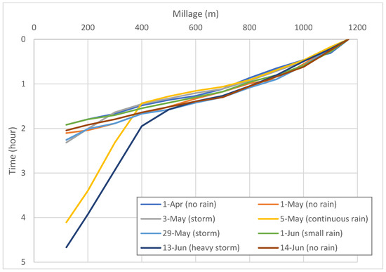 Figure 5 shows the DTS monitoring results under moderate rain. As shown in Figure 5, some moderate rain appeared on 3 May and 29 May, with recorded rainfall of 2.8 mm/15 mins and 3.6 mm/15 mins, respectively. This seems to affect the overall sewage temperature which decreased by 1 to 1.5 °C. Some dark blue plumes are observed at 6:00 on 3 May, 10:00 on 29 May and 15:00 on 29 May. For most of the cases, the dark blue plumes dissipated quickly with time, which demonstrated the adequate hydraulic performance of the sewer system under these conditions. On 3 May, subsequent domestic discharges occurring approximately 2 h after the storm resulted in an overall temperature higher than the original temperature suggesting a reduction in flow and therefore in dilution. Discontinuities in elevated temperature trends progressing downstream along the sewer’s length might suggest blockages as the warm waterfront encountered colder stagnant water. Such a discontinuity, at around 6:00 on 3 May, could be seen at 270 m and persisted for approximately 3 h (Figure 5a). This sudden discontinuity in temperature might suggest colder water backing up upstream from the treatment plant. A similar phenomenon was observed on 29 May. Following the larger rainfall amount, there is again a slight discontinuity in temperature at 250 m that may suggest colder water backing up upstream from the treatment plant (Figure 5b). This is not observed for the smaller rainfall event at 15:00. Hence, the occurrence of sewer blockage depended on the rainfall amount.