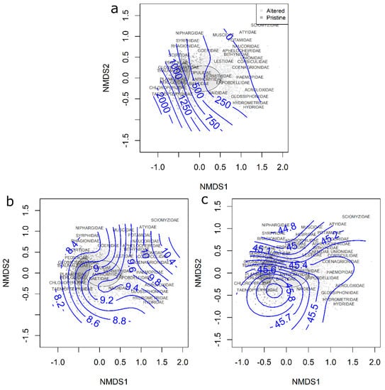 We used non-Metric Multidimensional Scaling (NMDS), a gradient analysis approach based on a distance or dissimilarity matrix, to visualize differences in taxonomic structure of the macroinvertebrate assemblage []. NMDS is an iterative procedure and was performed using the function metaMDS from the “vegan” package []. For this, we used the Bray-Curtis dissimilarity distance, a non-Euclidean distance used to quantify the compositional dissimilarity between two different samples, and log10(x + 1) transformed abundance in each sample. To examine the gradient of effect of the geographic variables, we fitted smooth surface splines using the ordisurf function from the “vegan” package. This procedure uses generalized additive models (GAMs) to overlay a smoothed response surface, which allows a more detailed interpretation than a simple linear vector [].