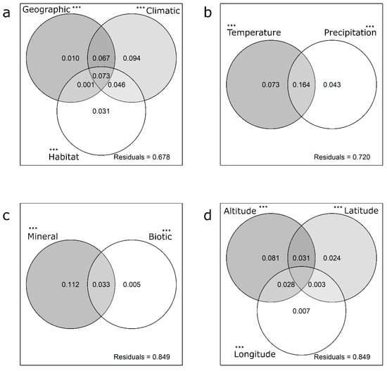 Results of variance partitioning on macroinvertebrate assemblage matrix. Panel (a) shows the results for the three considered groups of variables together while other panels show the detailed results for each group. Panel (b) refers to climatic variables, panel (c) to habitat variables and panel (d) to geographic ones. Values displayed are the adjusted R2 and negative values are not shown. The unexplained portion is shown in the bottom right of panels (Residuals). Significance of the pure effects are show as asterisks. *** p < 0.001.