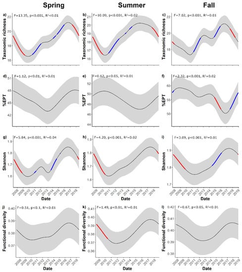 Using GAMMs, it was possible to assess the significance of the temporal trends for four out of eight tested metrics and all proved to be significant (p < 0.05) for all the seasons with coherent patterns. Over the first few years of monitoring (c. 2008–2011), family richness, Shannon and functional diversity declined significantly (Figure 5a–c,e). The taxonomic richness and Shannon notably increased between c. 2011–2017, decreased significantly thereafter (Figure 5a–c,g–i); these patterns were broadly mirrored by the functional diversity response, although fewer significant changes were detected for this metric (Figure 5j–l). The %EPT broadly contradicted the temporal trends observed for the other metrics, although they largely displayed a lack of significant temporal variations. One exception to this was a significant increase in values in the fall months after 2017, whereby an abrupt decline (c. 10–15%) occurred across the two years prior and then completely recovered by the end of 2018.