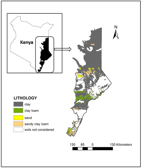 The study area (Figure 1) is located in Kenya and lies between LONG 1°61′ N and LONG 4°68′ S and between LAT 39°00′ E and LAT 41°59′ E. It covers the coastal plains and the adjacent hinterlands that extend up to an elevation of 200 m above sea level (m a.s.l.) covering a total of approximately 2.3 × 106 ha. The most common soil type is clay, which covers about 50% of the total area. Other major soil types are clay to sandy clay loam (13.7%), clay loam to loam (7.7%), sandy loam to sandy clay loam (6.5%) and clay loam (5.6%). For purposes of this study, the study area was assumed to be flat with an average slope of 5%.