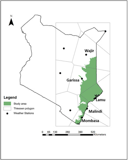 The study area is covered by five weather stations monitored by the Kenya Meteorological Department (KMD) and their locations are reported in Figure 2. The precipitation for all five weather stations ranges from 8.1 to 102.2 cm/year, most of which fall between the months of March and May (long rain season) and September to November (short rain season). The annual average temperature is high, between 26 and 29 °C, and the potential evaporation is approximately 145–287 cm/year.