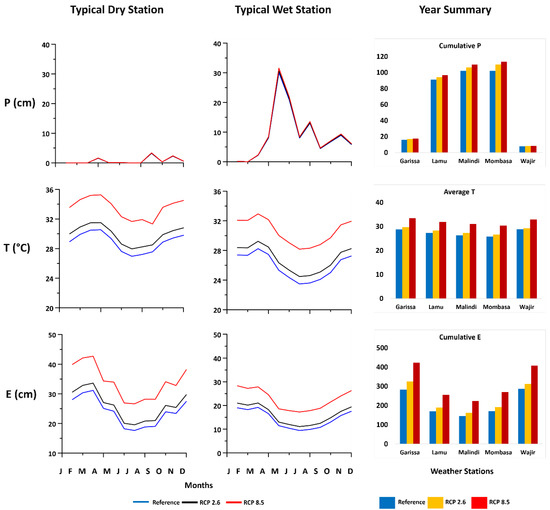 Graphical representation of seasonal distribution of precipitation (P), temperature (T) and potential evaporation (E) for typical dry on the left (Wajir) and wet in the centre (Mombasa) stations, as well annual cumulative precipitation, temperature and evaporation for the recorded reference period (1986–2005) and calculated estimates for Relative Concentration Pathways (RCPs) 2.6 and 8.5 (2081–2100) for all weather stations on the right.