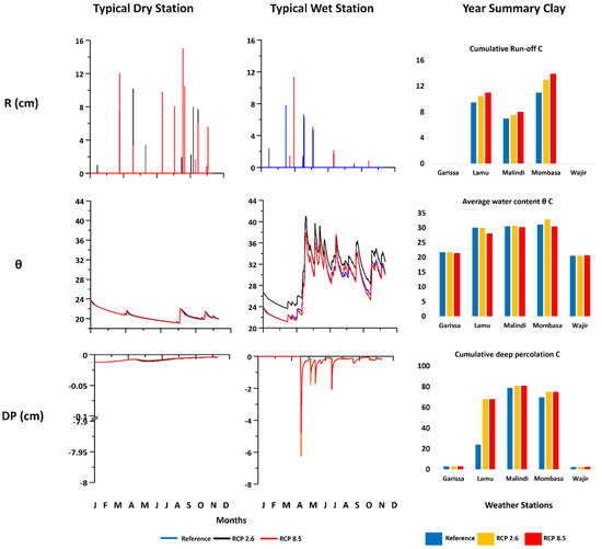 Graphical representation of HYDRUS-1D results showing distribution of runoff (R), water content (θ) and deep percolation (DP) over a year in clay loam soils for typical dry station on the left (Wajir) and typical wet station in the centre (Mombasa) stations, as well annual cumulative runoff, average water content and cumulative deep percolation for the recorded reference period (1986–2005), as well as calculated estimates for RCPs 2.6 and 8.5 (2081–2100) for all weather stations on the right.