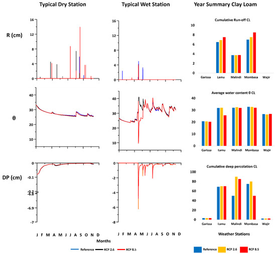 The results show that the average water infiltrated in the study area covered in the clay soils was 35.7 cm/year for the reference period, increasing to 45.9 cm/year for both the RCPs 2.6 and 8.5 scenarios. The average runoff for the same scenarios was 5.5, 6.6 and 6.6 cm/year respectively, while the average water content is 27, 27 and 26% for the respective scenarios. The deep percolation represents ≈11% of the total precipitation, while the surface runoff is 1.7% of the same. The specific scenario results are as follows: the deep percolation for reference period was 3, 24, 79, 70 and 2.3 cm/year for Garissa, Lamu, Malindi, Mombasa and Wajir, respectively. The average water content for the same stations was 27, 30, 30, 31 and 27% of the investigated soil column while cumulative runoff was 9.5, 7 and 11 cm/year for Malindi, Mombasa and Lamu and negligible for Garissa and Wajir (Figure 4).