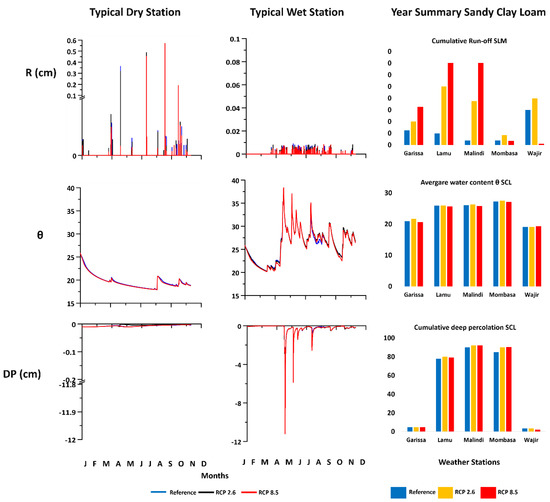 Graphical representation of HYDRUS-1D results showing distribution of runoff (R), water content (θ) and deep percolation (DP) over a year in sandy clay loam soils for typical dry station on the left (Wajir) and typical wet station in the centre (Mombasa) stations areas, as well annual cumulative runoff, average water content and cumulative deep percolation for the recorded reference period (1986–2005), as well as calculated estimates for RCPs 2.6 and 8.5 (2081–2100) for all areas on the right.